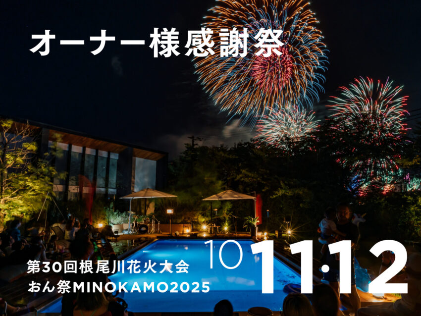 10/11(土)大野Villa秋まつり × 第30回根尾川花火大会 10/12(日)市民花火大会 × おん祭MINOKAMO2025 いつもCHECK HOUSEをご愛顧いただいているオーナーの皆さまへ、日頃の感謝を込めて——今年も「CHE
