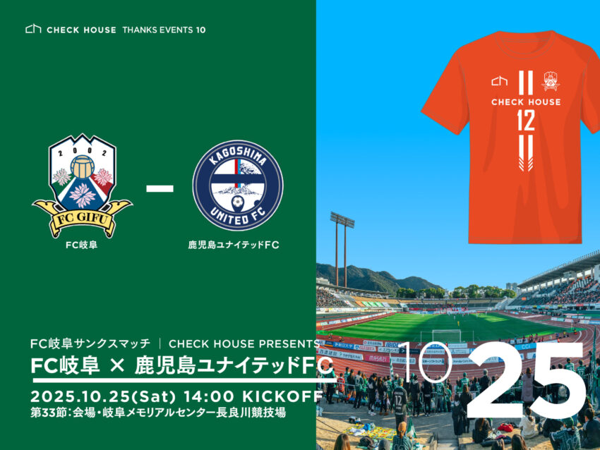 10月25日(土)に、FC岐阜のオフィシャルパートナーであるチェックハウスは、鹿児島ユナイテッドFC戦 のCHECK HOUSE サンクスマッチを開催いたします。 日頃から応援してくださる皆さまへの感謝を込めて、“CHECK HOUSE P