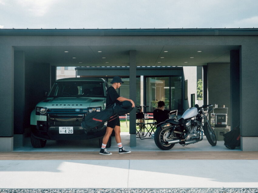 〜庭 × ガレージ × 開放感〜 ——L字型の配置が生む、“外とつながる暮らし”。 大開口の窓で庭へ大きくひらき、ガレージ・テラス・LDKがゆるやかにつながるL字型の住まい。 窓を開けると風が通り抜け、家の内側にいながら外の心地よさを感