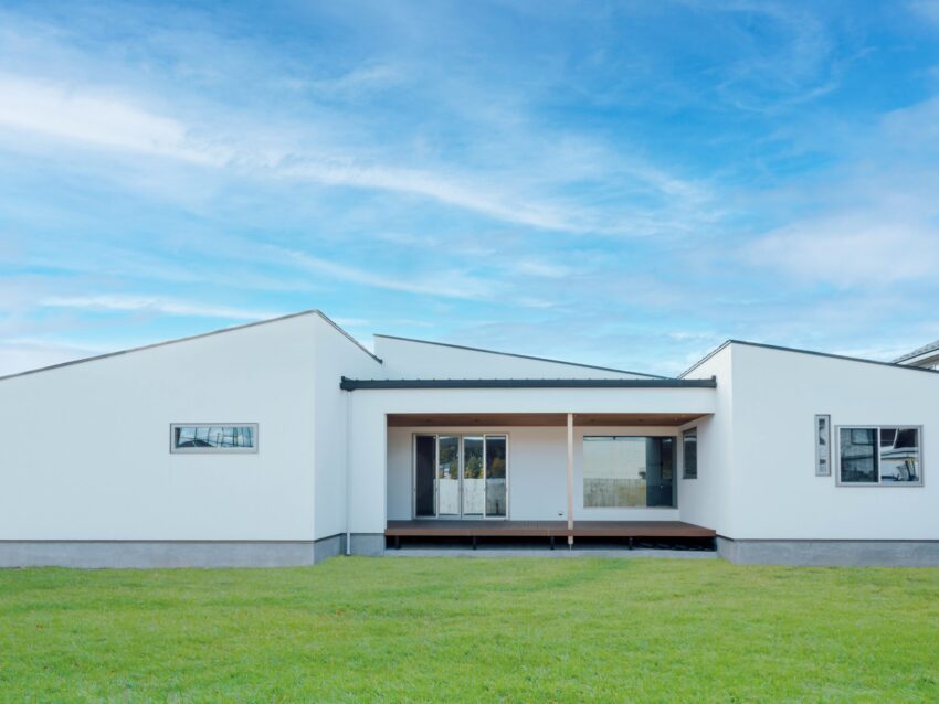 〜庭 × 開放感 × 平屋〜 ——L字型の配置が“外とつながる暮らし”をつくる。 庭へ向かって大きく開かれたL字型の平屋。 窓を開ければ自然の風がゆるやかに通り抜け、四季を感じながらくつろげる“庭とつながる住まい”です。