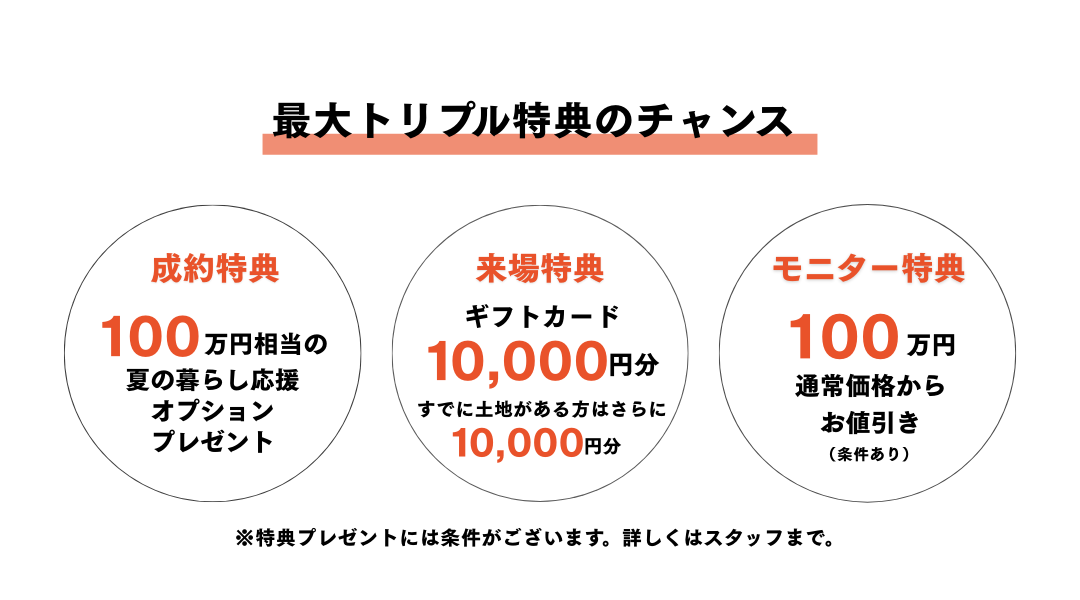 特典① 【来場特典】10,000円分のAmazonギフトカードプレゼント 進呈条件 ・各種SNSのフォロー( Instagram/TikTok/YouTube ) ※画面確認をさせていただきます。事前にフォローいただけますとスムーズです。 ・来場SRのGoogle口コミ投稿のご協力 ・ご夫婦様またはご家族様でのご来場 ※店舗、非住宅をご希望の場合は、この限りではございません。 ・2年以内の建築 ・来場後、次回事前審査を行い、審査通過時にアマギフをお渡しさせていただきます。 ・土地があって設計相談に進まれる方は、さらに10,000円分プレゼント 特典② 【成約特典】100万円相当の夏の暮らし応援オプションプレゼント ※内容詳細はスタッフまで。 特典③ 【モニター特典】100万円のお値引き モニター特典とは? お家を建てた後に ✅施工例の撮影 ✅一定期間のモデルハウスとしての利用 ✅HP・カタログ・SNS等全ての媒体でのお住まいの紹介や写真の利用 等に承諾いただくことで 通常よりお得に家づくりができる特典です。 ※各種特典プレゼントには条件がございます。詳しくはスタ ショールームは事前予約制となっております。お早めのご予約をお勧めいたします。 皆様のご来場を心よりお待ちしております。素敵な家づくりの一歩を、この機会にぜひ踏み出してください。